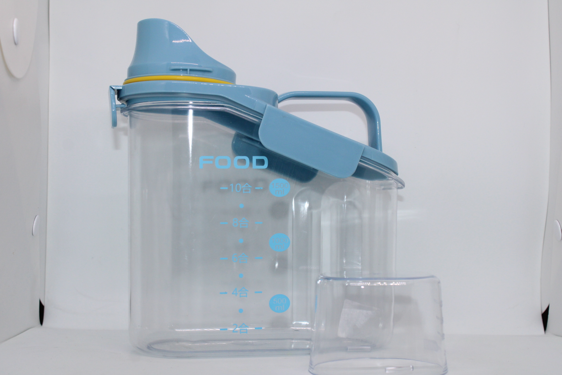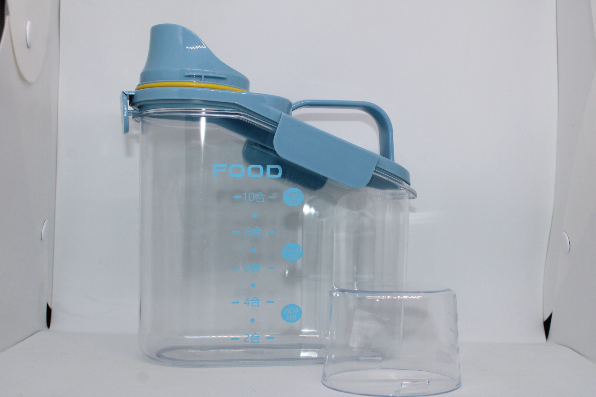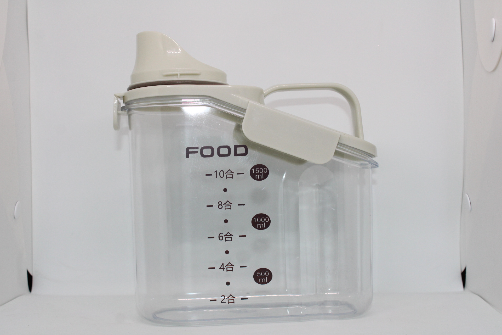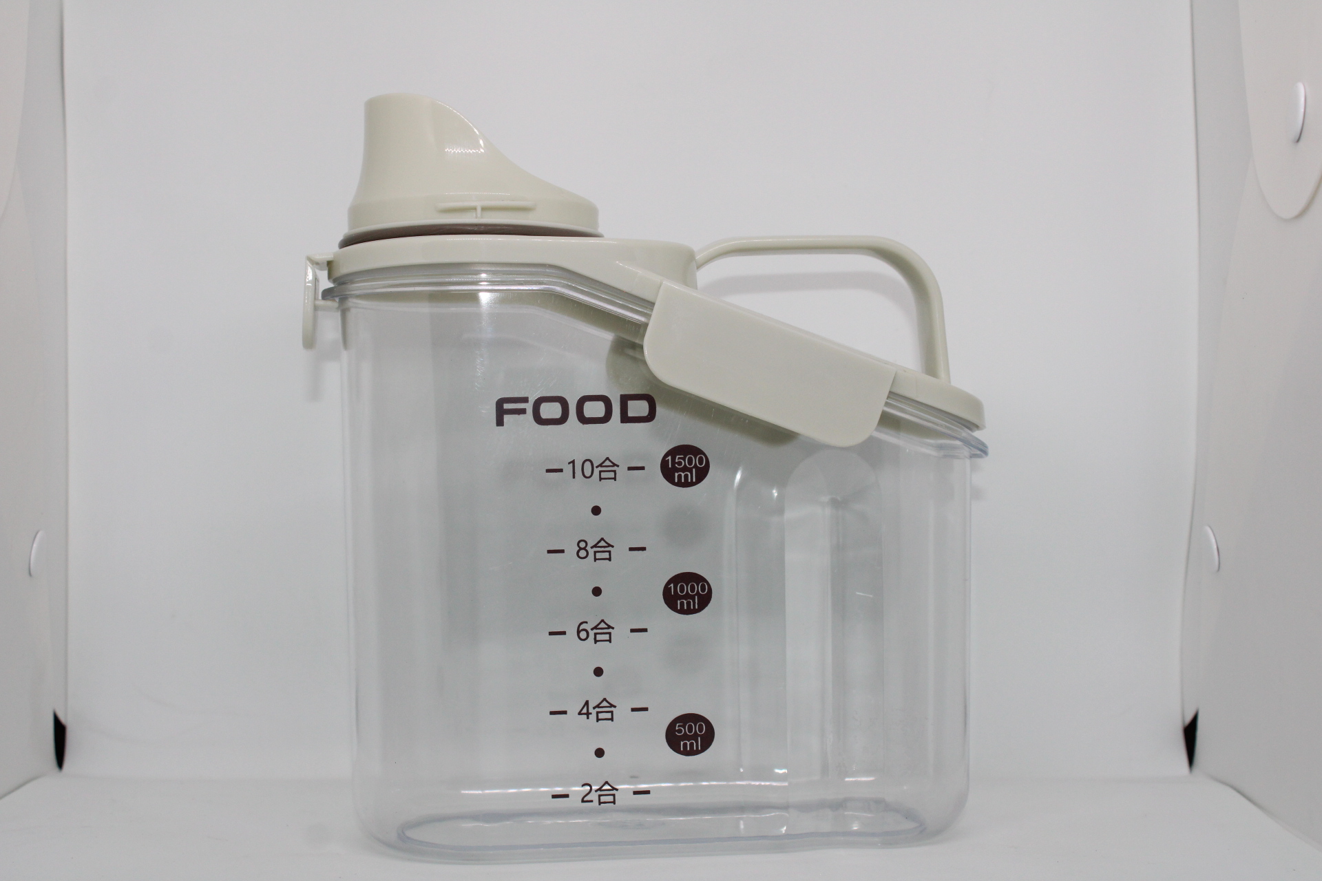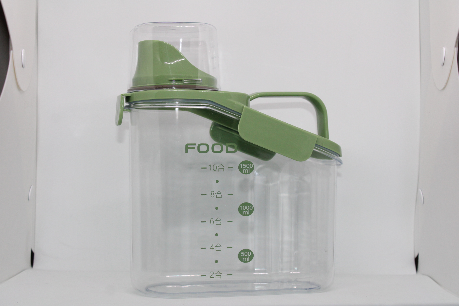 Recipiente hermético de 1500 ml con tapa dosificadora y medidas impresas, perfecto para conservar alimentos frescos y organizados.